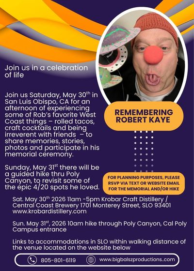 Join us Saturday, May 30th from 11am -- 5pm on the reserved patio at Krobar Craft Distillery, 1701 Monterey Street, SLO CA 93401 to share memories, stories, photos and spend time together processing our loss with a small memorial service. (Memorial service to begin once we reach critical mass during this timeframe to allow travel time for our community coming from far and wide.)